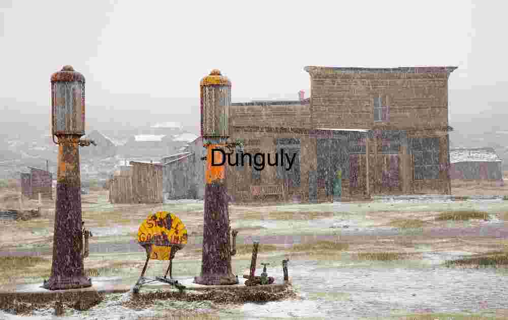 Description: The image depicts an abandoned gas station in a ghost town during a snowstorm. Two rusted gas pumps stand prominently in the foreground, with remnants of their original orange paint still visible. Between the pumps, a weathered sign reads “Shell Gasoline.” In the background, several dilapidated wooden buildings, partially covered in snow, add to the desolate atmosphere. The snow is falling heavily, creating a sense of isolation and abandonment. This image is interesting as it captures the eerie beauty of a forgotten place, frozen in time and nature’s elements.