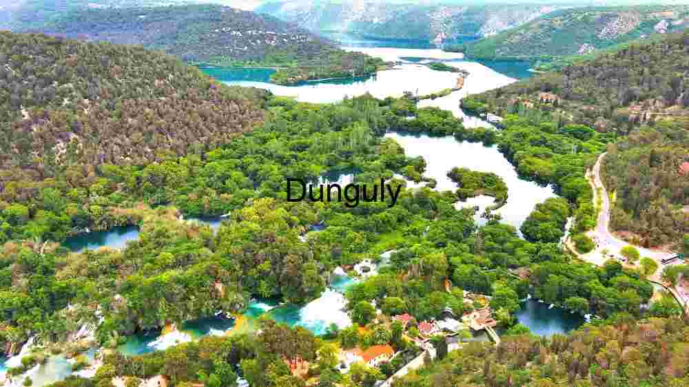 This image captures a breathtaking aerial view of a lush, green landscape with multiple interconnected lakes. The vibrant turquoise waters create a stunning contrast with the rich greenery of the surrounding forest. A winding road meanders through the scene, offering access to this tranquil natural oasis. The image showcases the beauty of natural water bodies within a forested area, highlighting the serene and untouched aspect of nature.