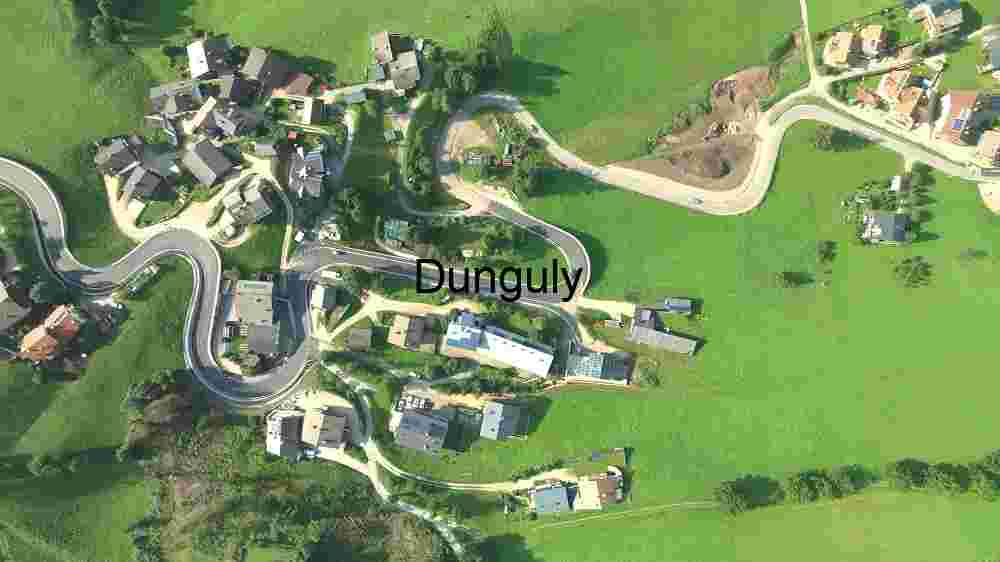 This image captures an aerial view of a winding road meandering through a vibrant green landscape dotted with houses. The contrast between the structured, grey asphalt road and the natural, verdant fields highlights the intersection of human habitation and nature. The curving path of the road adds a dynamic element to the composition, making it an interesting study of rural infrastructure.