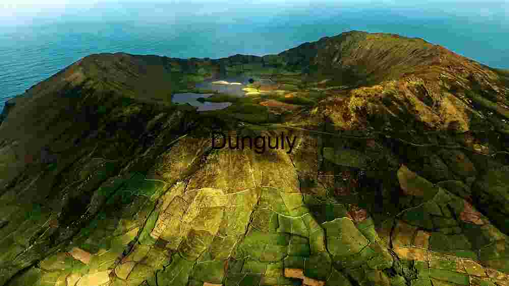 Description: This image captures an aerial view of a large volcanic crater with a lake at its center, surrounded by lush green farmland. The crater’s steep walls and the patchwork of fields create a striking contrast, with the blue ocean visible in the background. The interplay of light and shadow across the landscape adds depth and highlights the natural beauty of the area. This scene is both visually stunning and geologically significant, showcasing the interaction between volcanic activity and human agriculture.