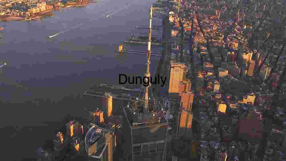 Description: This image captures an aerial view of One World Trade Center, also known as the Freedom Tower, in Lower Manhattan, New York City. The photograph showcases the iconic spire of the skyscraper, which is the tallest building in the Western Hemisphere. The Hudson River is visible to the left, with boats creating trails on the water. The densely packed buildings of Manhattan stretch out to the right, bathed in the warm light of either sunrise or sunset. The image highlights the architectural marvel of the Freedom Tower and the bustling urban landscape of New York City.