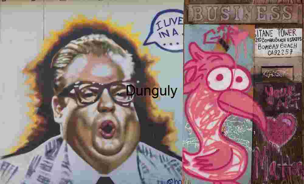 graffiti,street,art,caricature,cartoon,mural,wall,urban,colorful,expression,identity,commentary,speech,bubble,checkered,suit,glasses,character,painting,signage,text,irony,satire,location,Bombay,Beach,California,Diane,Tower,installation,public,visual,statement,community,voice,whimsy,bird,pink,eyes,heart,tagging,layered,contrast,creative,exhibit,playful,exaggerated,figure,mid-speech,culture,subversive,meaning