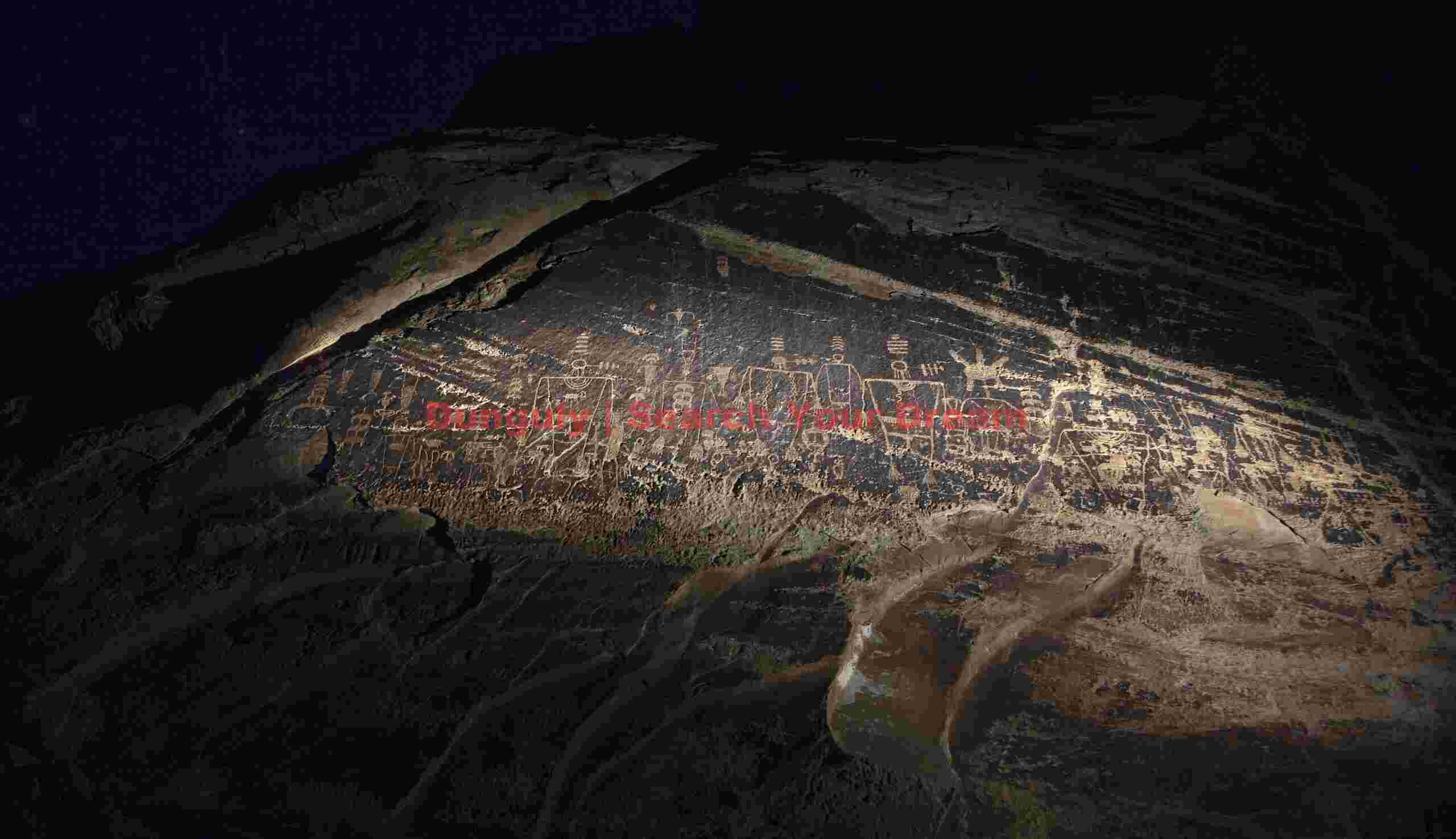 Description: A creatively illuminated photograph of the Butler Wash petroglyph panel using light painting techniques. The selective illumination brings out the depth, texture, and intricate details of the ancient rock carvings, making individual glyphs stand out dramatically against the darker background. This photographic approach reveals aspects of the petroglyphs that might be difficult to see in natural lighting conditions.