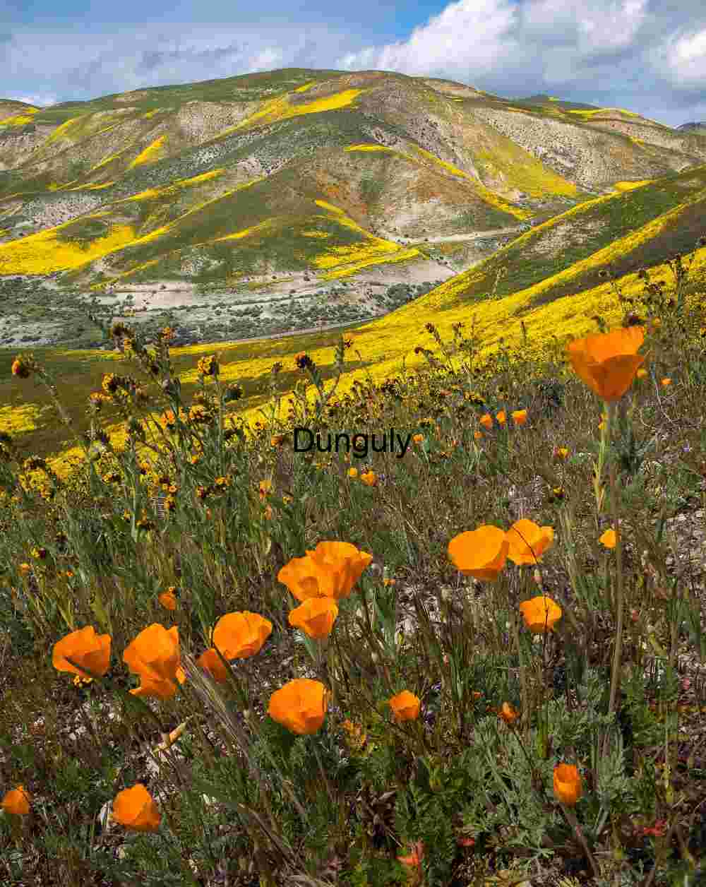 spring,landscape,flowers,poppies,California,wildflowers,hills,orange,yellow,green,nature,bloom,seasonal,trail,road,sky,clouds,blue,grasses,soil,contrast,ecology,flora,botanical,scenic,meadow,field,environment,beauty,petals,rolling,terrain,serene,vibrant,bright,outdoors,season,habitat,vegetation,earth,peaceful,travel,exploration,florae,photography,background,panorama,tranquil,organic,natural,renewal