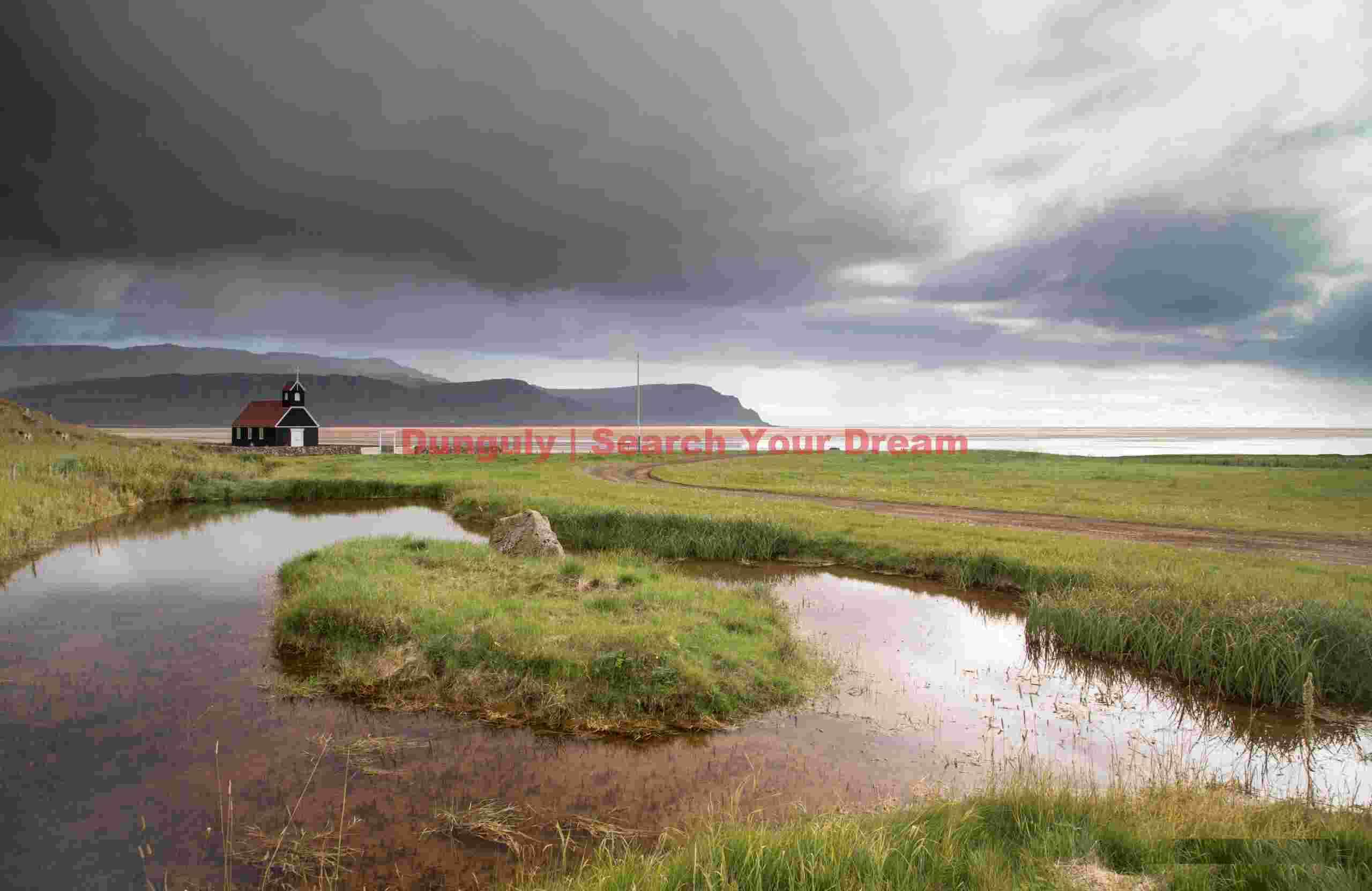 Title: Church and pond; Rauðasandur, Westfjords