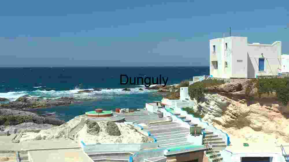 Description: This image captures a picturesque coastal scene featuring a white building with blue accents perched on a rocky shoreline. The building overlooks the vibrant blue Mediterranean Sea, with waves crashing against the rocks. The foreground includes a series of white steps and terraces, some with green and orange accents, leading down to the water. The clear blue sky and the serene sea create a tranquil and inviting atmosphere, making this location an ideal spot for relaxation and scenic views.