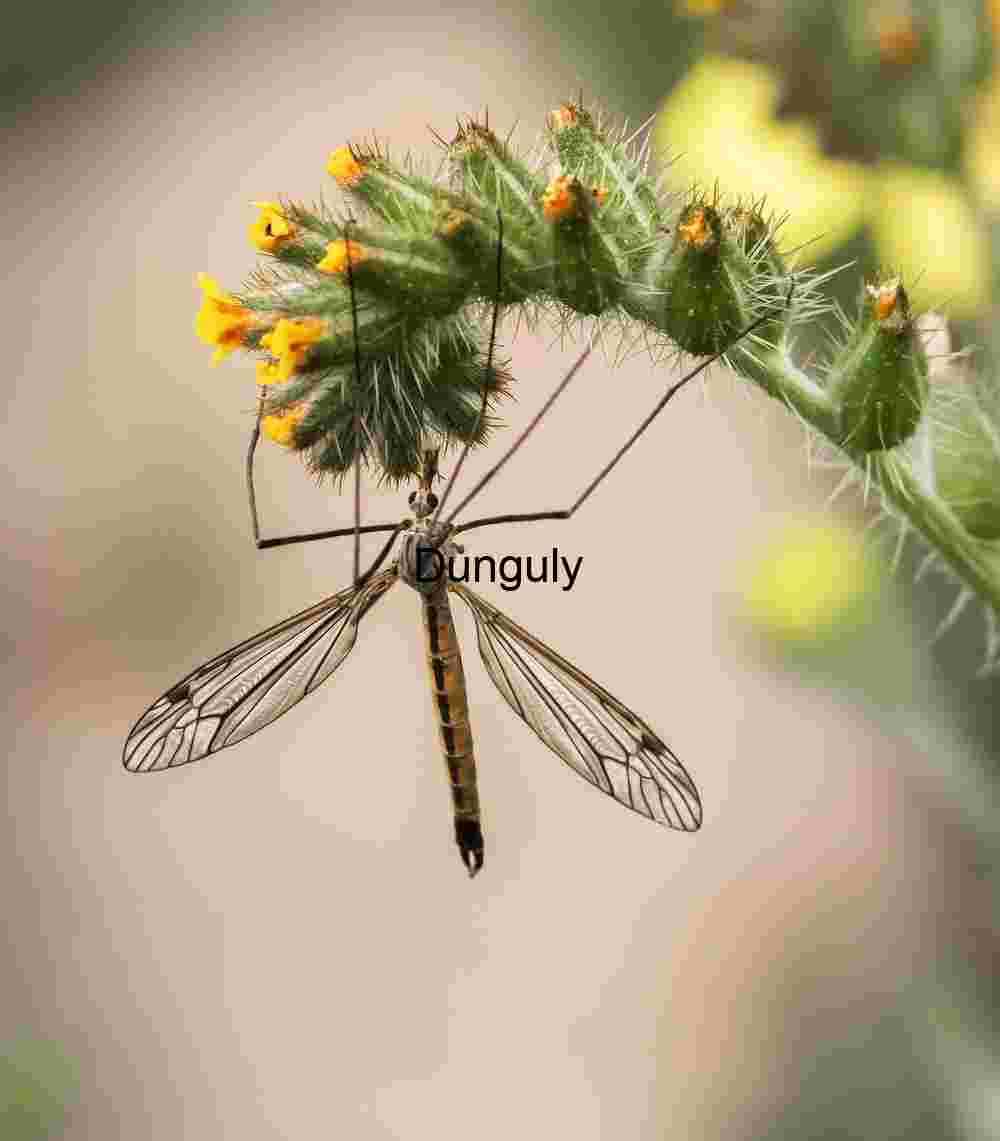 A crane fly hangs upside down from a spiky green stem adorned with bright yellow blossoms, its slender legs and translucent wings sharply defined against a softly blurred background. The image captures the fragile elegance of the insect in perfect stillness, highlighting the venation of its wings and the tactile texture of the flowering plant. This close-up macro scene invites viewers into the quiet intimacy of nature’s microcosm, where form, function, and fleeting beauty converge.
