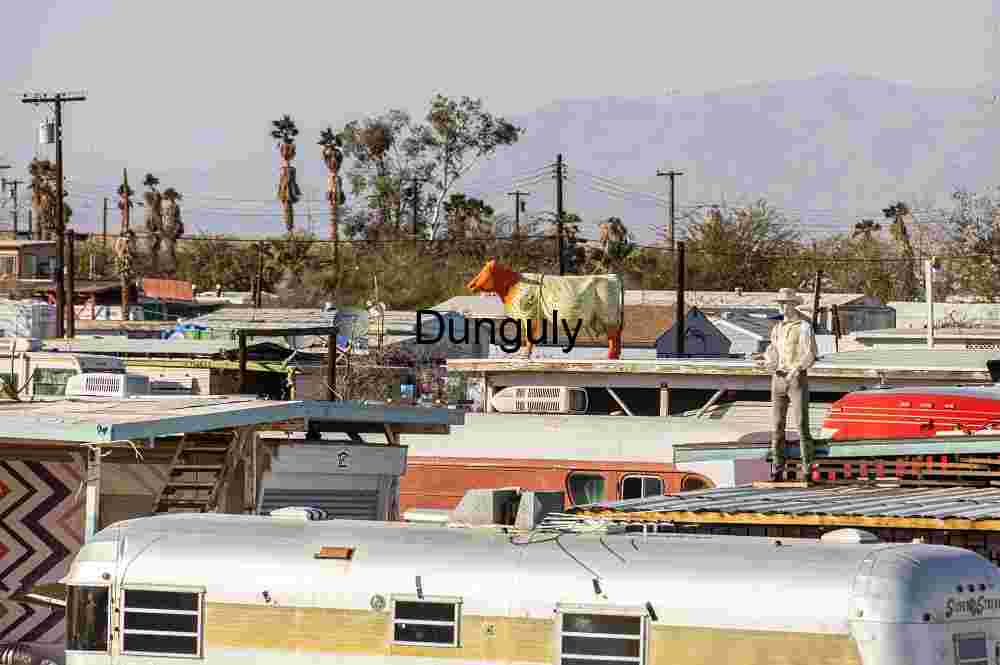 In a sunbaked trailer park nestled within an arid landscape, palm trees sway among mobile homes and utility poles. Perched atop two trailers are unexpected sculptural elements: a life-sized orange cow draped in decorative fabric and a white-clad cowboy figure frozen in silent vigil. These playful rooftop installations inject humor and surrealism into an otherwise utilitarian setting, blending kitsch with commentary. The distant mountains, dry vegetation, and scattered wires frame a scene that speaks to eccentricity, adaptation, and the art of personal expression in unconventional spaces.