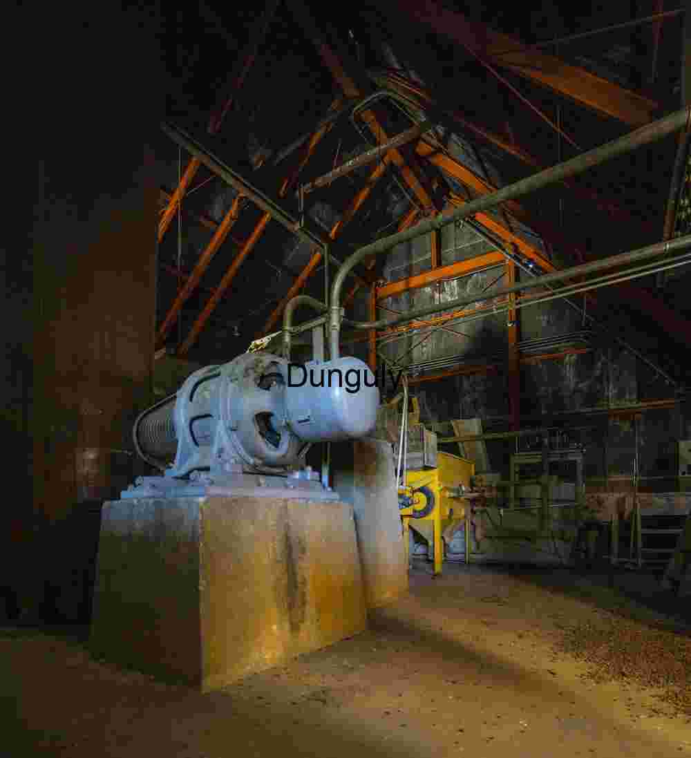 Inside a dim, weathered facility, a large motor or pump rests atop a concrete base, surrounded by rusted pipes, beams, and structural remnants. Natural light filters through the high, triangular roof, casting shadows across dust-covered surfaces and forgotten equipment. This image evokes the quiet aftermath of productivity—where mechanical purpose fades into stillness, and the architecture of labor becomes a relic of time.