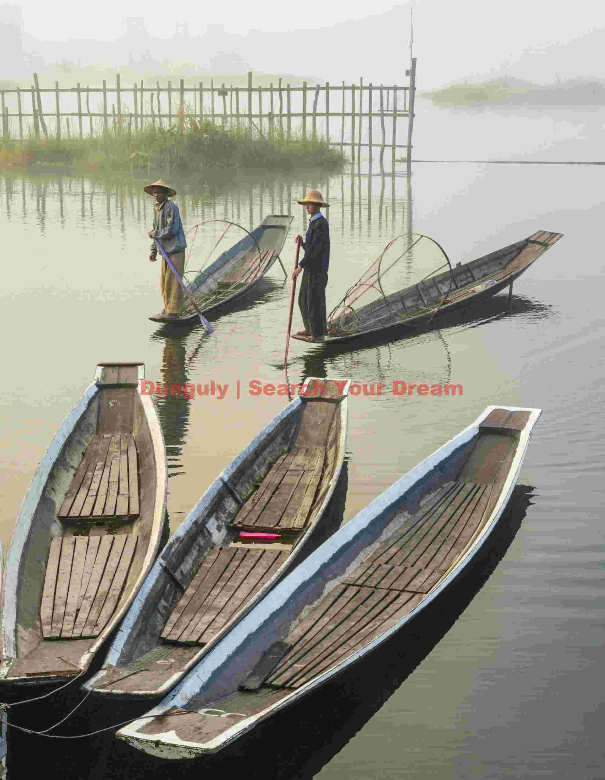 Description: Intha fishermen demonstrate their unique leg-rowing technique on Inle Lake. This distinctive fishing method, practiced nowhere else in the world, allows fishermen to navigate shallow waters while keeping their hands free for nets and traps.