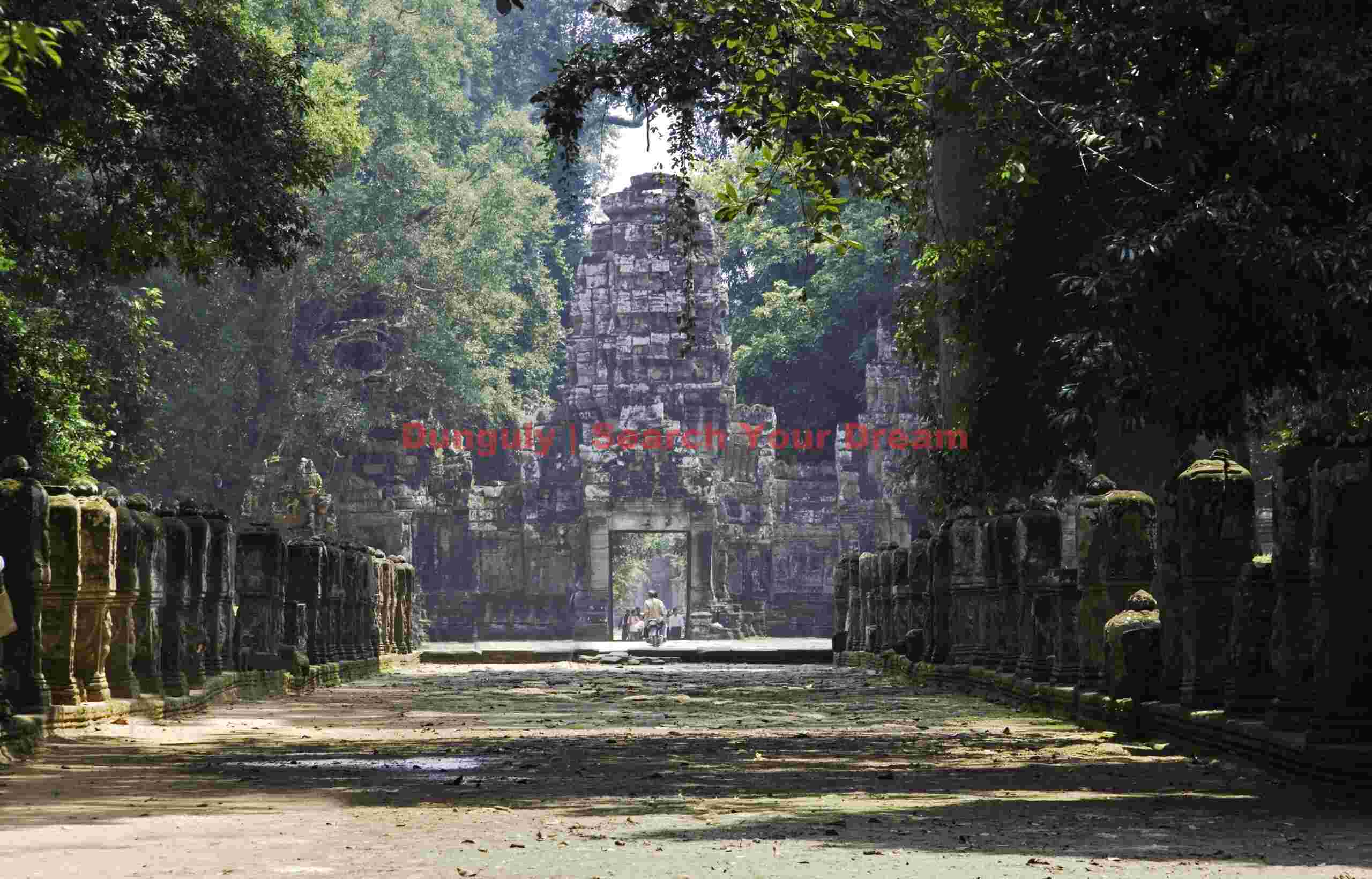 Description: Angkor Thom, the great city of the Khmer Empire, features enigmatic stone faces and elaborate bas-reliefs. The Bayon temple’s serene visages gaze across the ancient capital, embodying Khmer Buddhist cosmology.