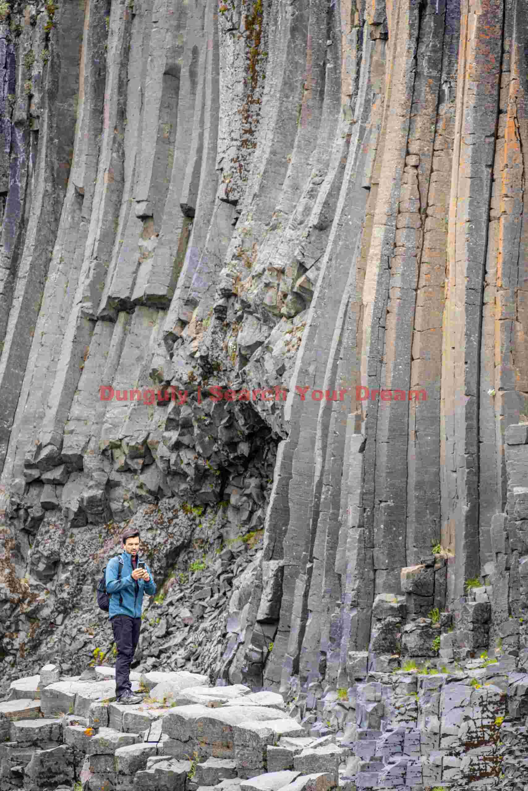 DESCRIPTION: The remarkable basalt formations at selfie with basalt columns display Iceland’s volcanic origins. These hexagonal columns formed from cooling lava flows millions of years ago, creating natural geometric patterns. The scene demonstrates the architectural precision inherent in geological processes.