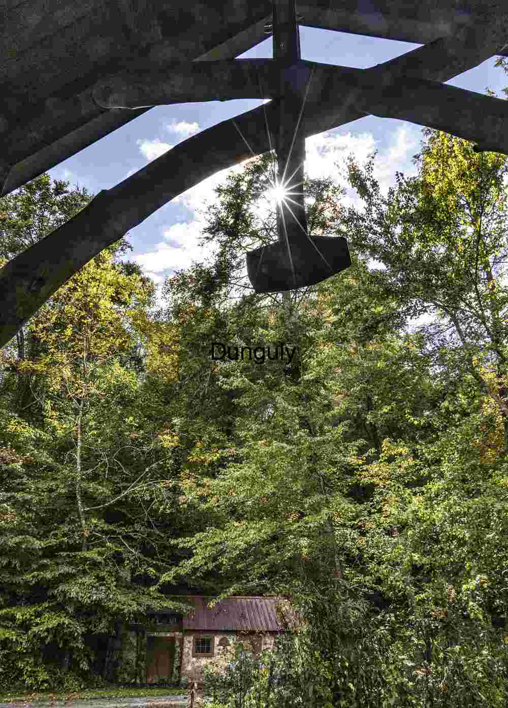 For Commercial Stock Photo Buyers: Capture the essence of history and craftsmanship with this striking, high-contrast image. The dramatic silhouette of the overhead forging hammer, set against a vibrant sunburst and lush natural backdrop, instantly communicates themes of strength, labor, and tradition. Perfect for use in advertising, editorials, or digital content related to heritage sites, metalworking, skilled trades, Appalachian culture, or rustic architectural design. Its unique composition offers strong visual impact for book covers, website headers, and marketing materials seeking an authentic, handcrafted aesthetic. A compelling blend of history and dramatic nature photography.