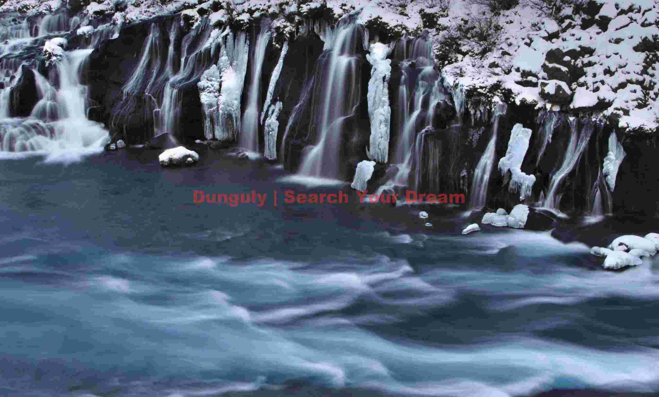 Description: A stunning photograph capturing hraunfossar cascades in winter, displaying the raw power and beauty of Iceland’s cascading waters.