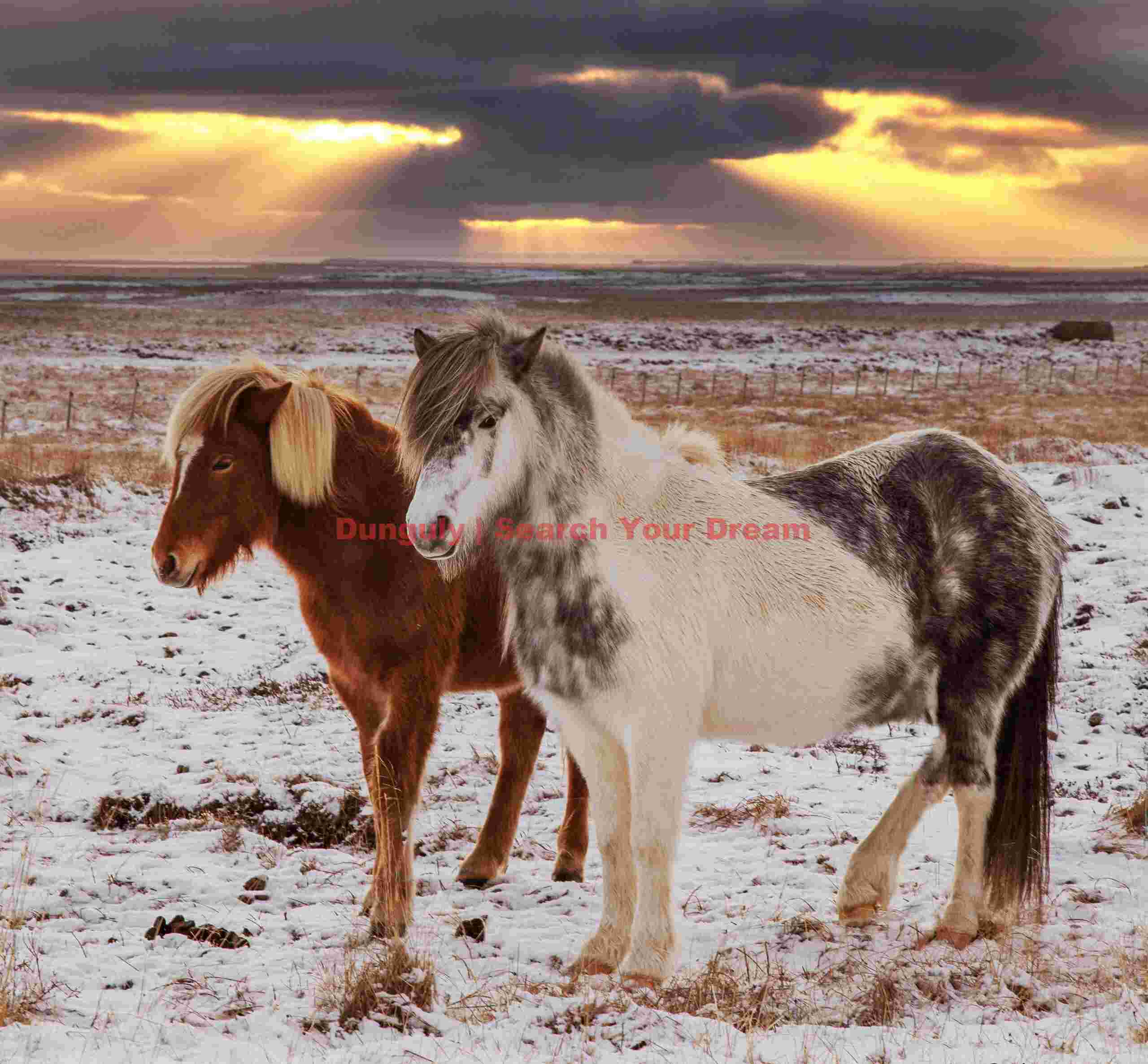DESCRIPTION: A captivating photograph of icelandic horses below god-rays captured at Snaefellsnes Peninsula, Iceland. The Icelandic horse, a unique breed unchanged for over 1000 years, exemplifies strength and beauty. These sure-footed animals with their thick manes are perfectly adapted to Iceland’s rugged terrain and harsh climate.