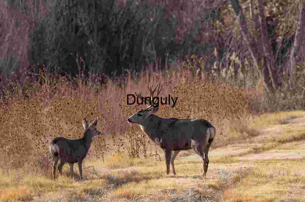 ALT Text: Two young Mule Deer, one facing forward, standing on a grassy path surrounded by dry, brown and gold winter vegetation under soft natural light.