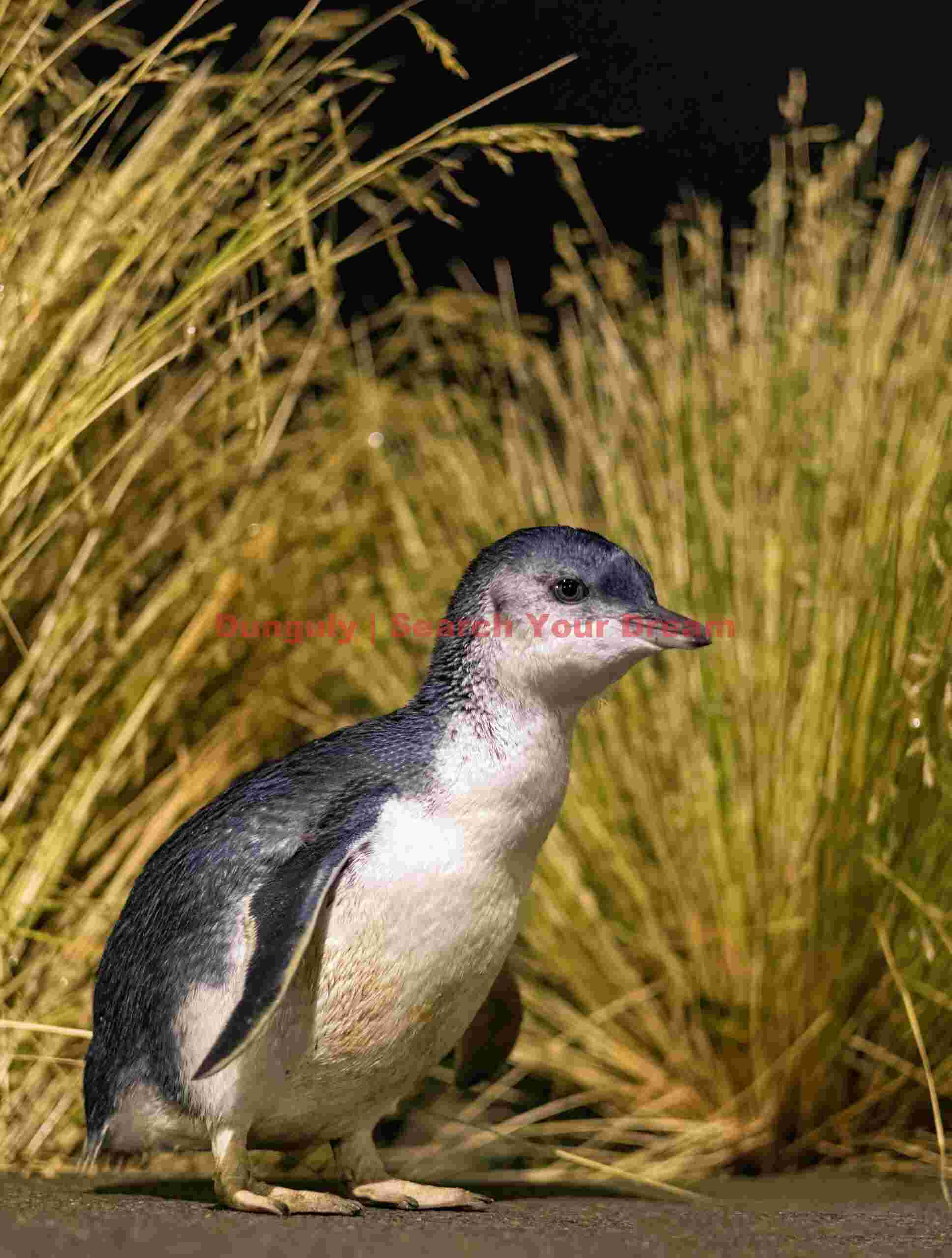 Description: Little blue penguin by grasses along the road captured in South Island, New Zealand. This wildlife photograph showcases New Zealand’s remarkable penguin species in their natural coastal habitat.