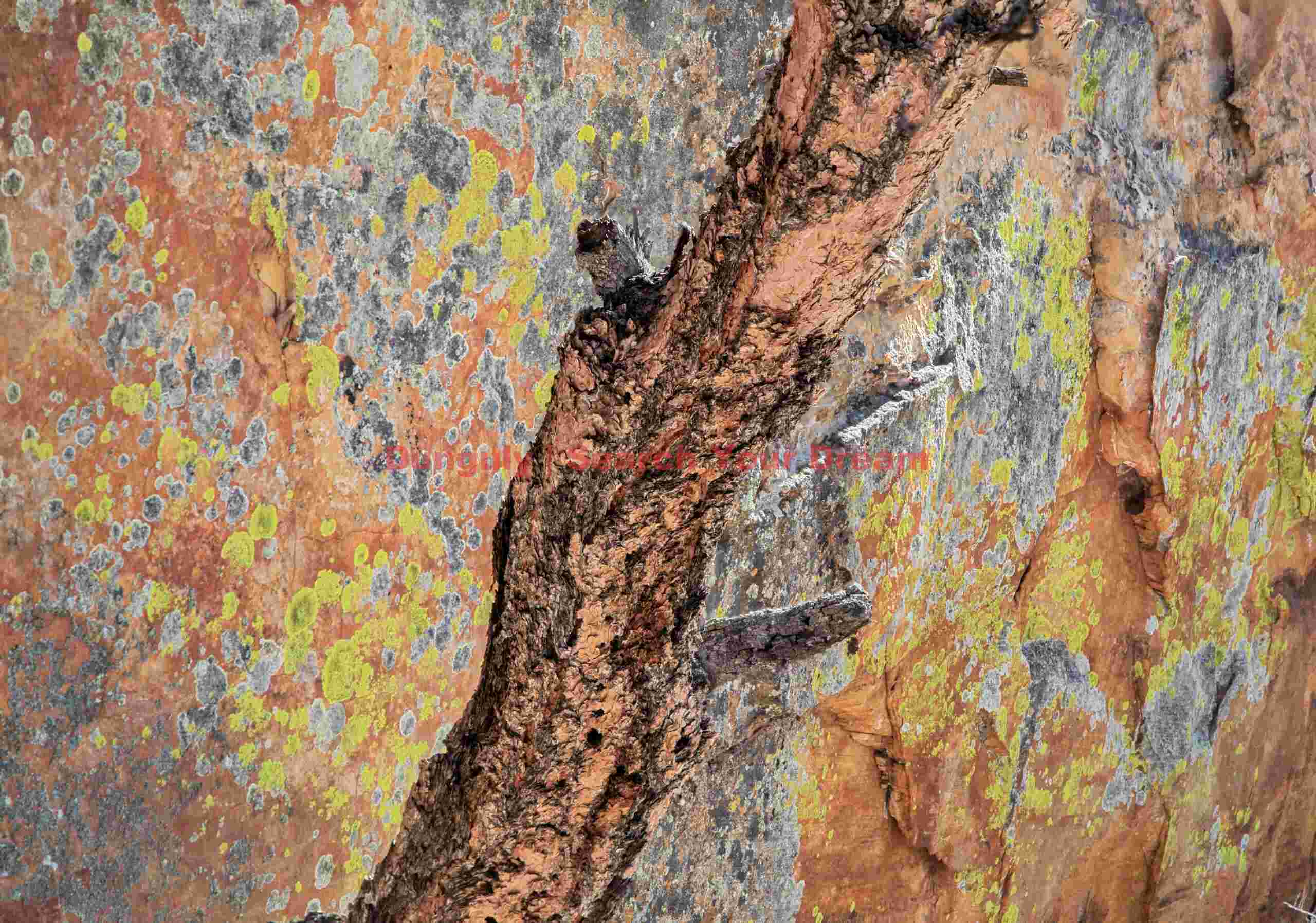 A gnarled tree clings to a vibrant lichen-covered wall in The Sand Hills. This composition beautifully illustrates the layers of life thriving against the backdrop of ancient Vermillion Cliffs sandstone.