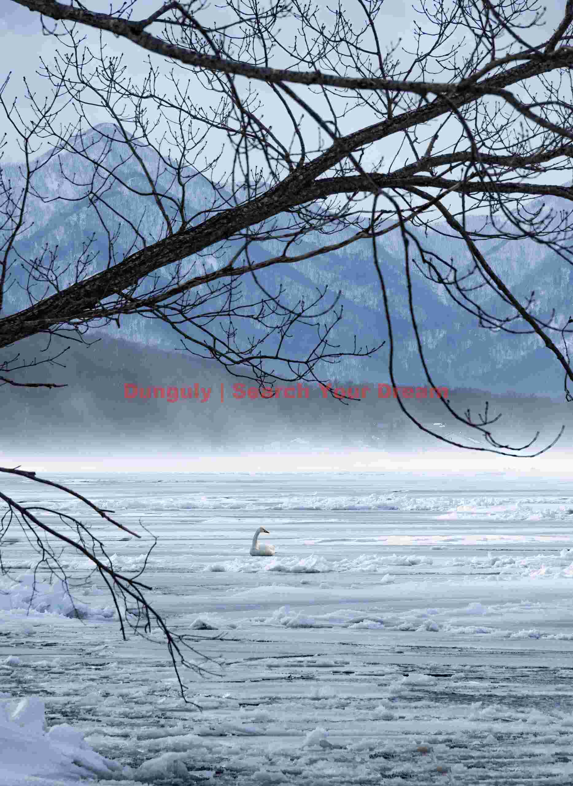 Description: Whooper swans weather a fierce snowstorm at Lake Kussharo, Hokkaido. These hardy birds remain through winter’s harshest conditions, their white plumage blending with swirling snow while they shelter in thermal areas of the frozen lake.