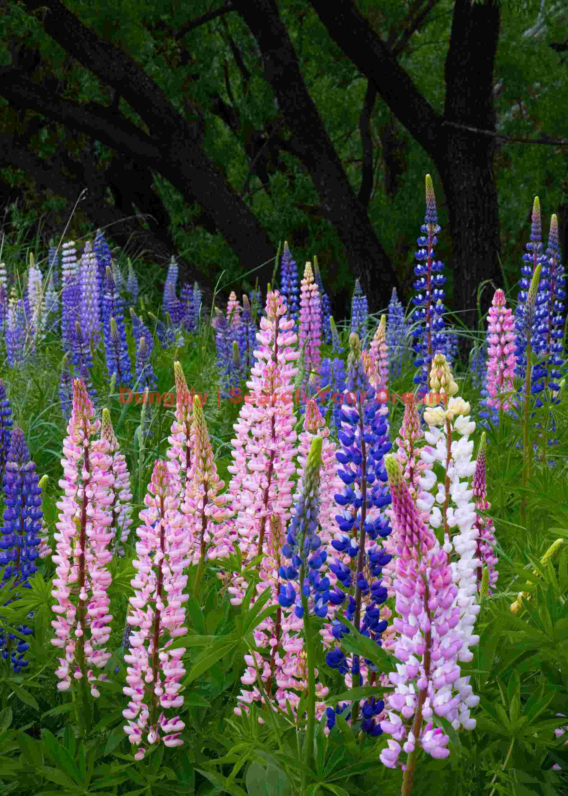 Description: Lupins and shadowed trees captured in South Island, New Zealand. Featuring colorful lupins, which bloom spectacularly across South Island’s lakes and mountains.