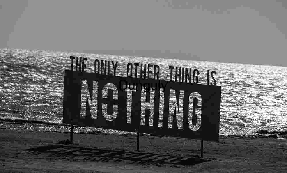 art, installation, Bombay, beach, Salton, sea, nothing, sign, message, desert, sand, dust, wind, haze, mist, surreal, stark, barren, empty, isolation, lonely, silence, void, philosophy, conceptual, existential, reflection, statement, symbolic, solitude, environment, decay, forgotten, abandoned, haunting, atmospheric, contemporary, minimal, vast, openness, landscape, shoreline, water, contrast, sky, horizon, mysterious, bleak, human, perspective, thought, vision, abstract