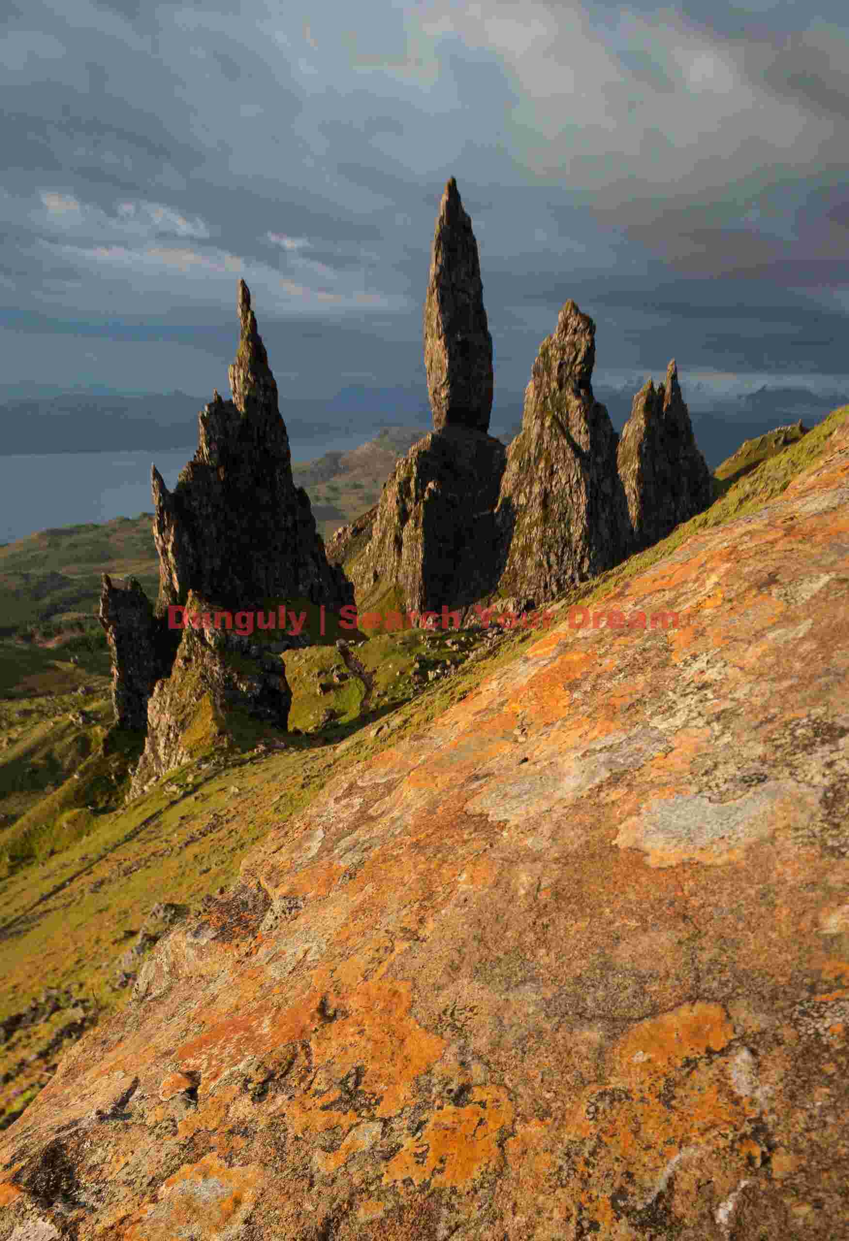 Title: Old Man of Storr with ochre lichenous rock
