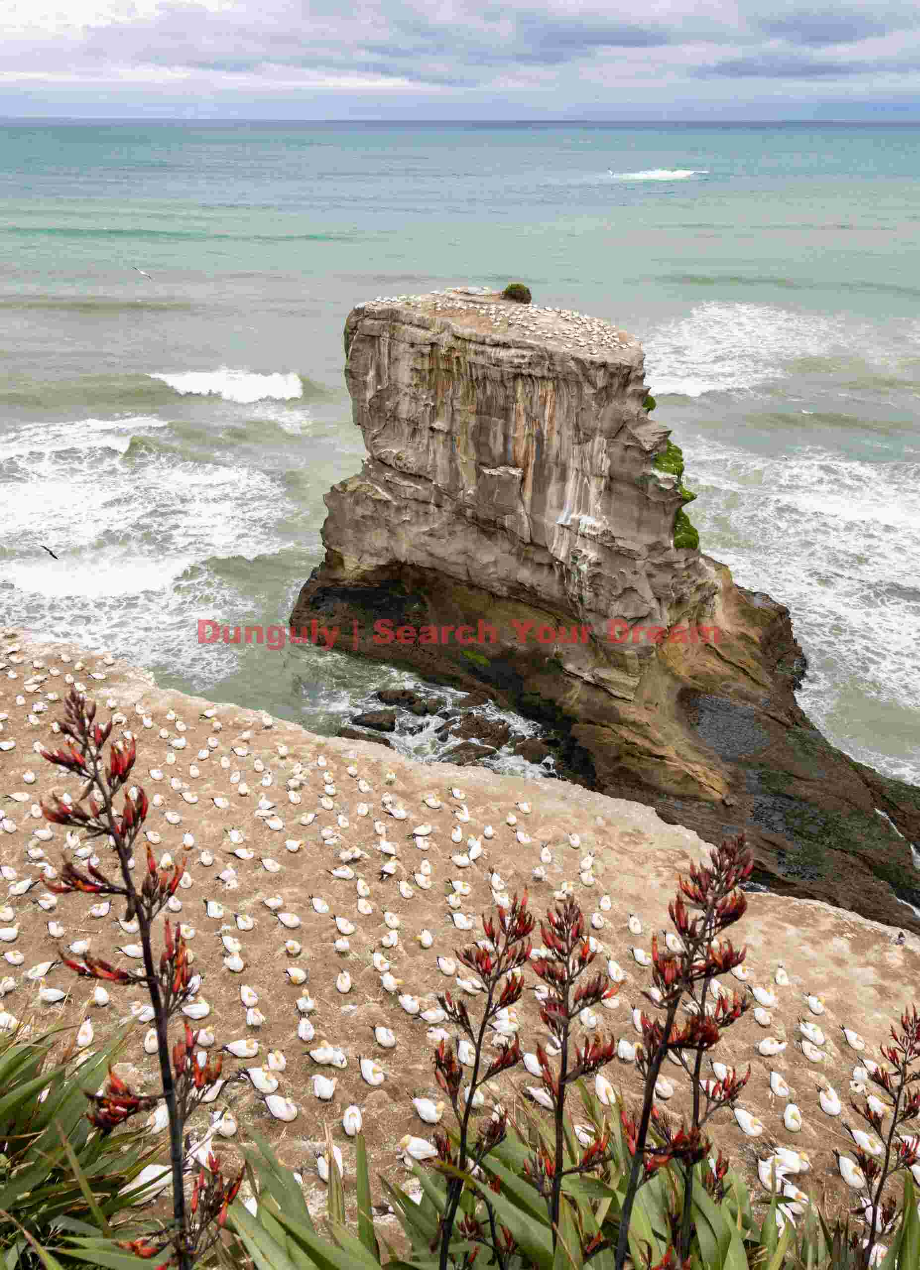 Description: Onshore and sea stack colonies captured in Muriwai gannet colony, North Island, New Zealand. A stunning landscape photograph capturing the natural beauty of this unique location.