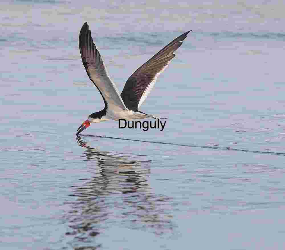 A black skimmer soars inches above a still waterbody, its lower mandible delicately carving a line through the surface in search of prey. With wings stretched to full span and vivid contrast between its dark back and white underside, the bird exudes both grace and intensity. Its mirrored reflection in the serene water adds symmetry to the scene—turning this fleeting behavior into a portrait of elegance, adaptation, and wild purpose.