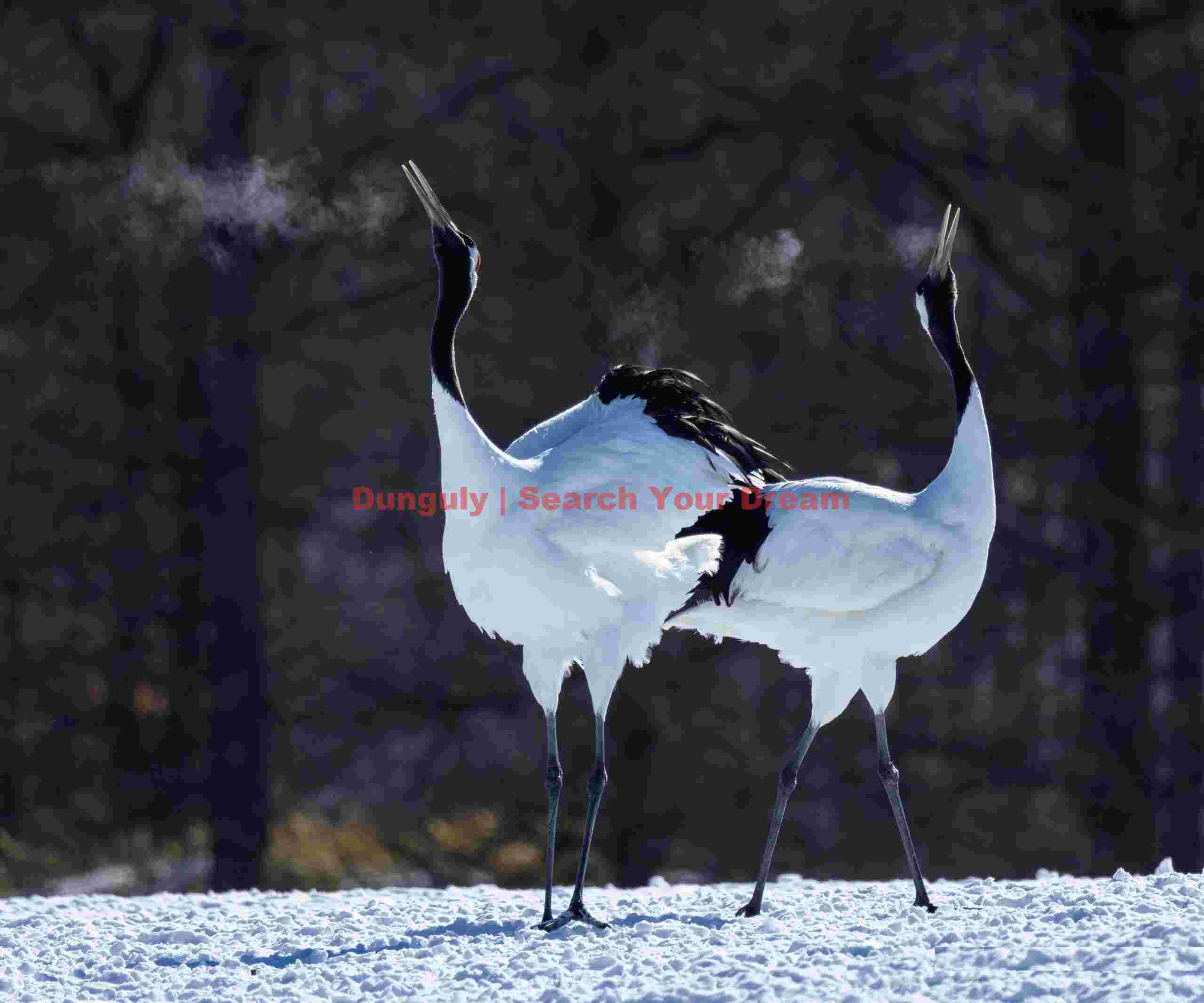 Title: Red-crowned crane duet with breath condensation
