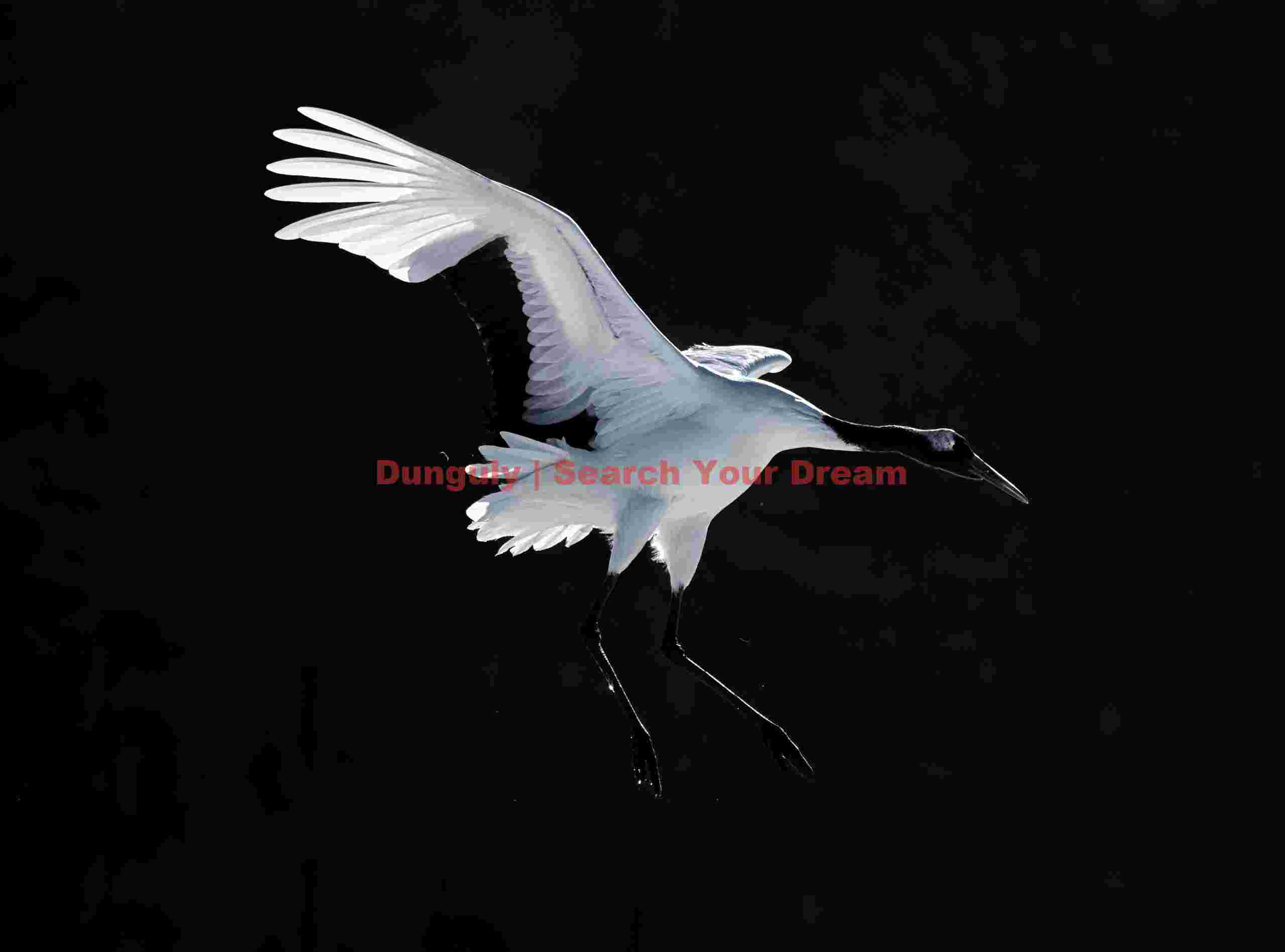 Title: Red-crowned crane in flight on black