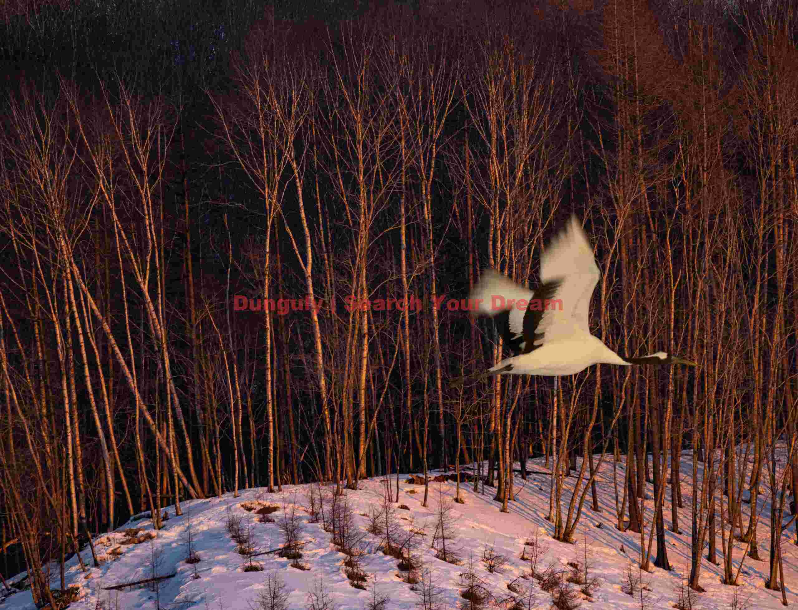 Title: Red-crowned crane in flight past trees in evening light Tsurui-Ito Tancho Sanctuary, Hokkaido