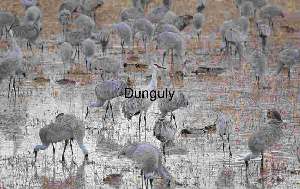 ALT Text: Close-up of numerous Sandhill Cranes (Antigone canadensis) and a few Mallard ducks wading and feeding in a muddy, shallowly flooded field on a cloudy day.