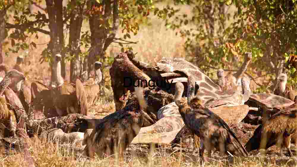 Keywords: vultures, scavengers, wildlife, nature, ecosystem, feeding, carcass, decomposers, birds of prey, natural habitat, dry grassland, sparse trees, wild animals, biodiversity, conservation, environment, survival, adaptation, predators, carrion, feathers, wings, beaks, flock, group, gathering, cleanup crew, food chain, circle of life, decomposition, nature’s balance, harsh conditions, wilderness, outdoors, field, landscape, photography, observation, study, research, biology, ornithology, zoology.