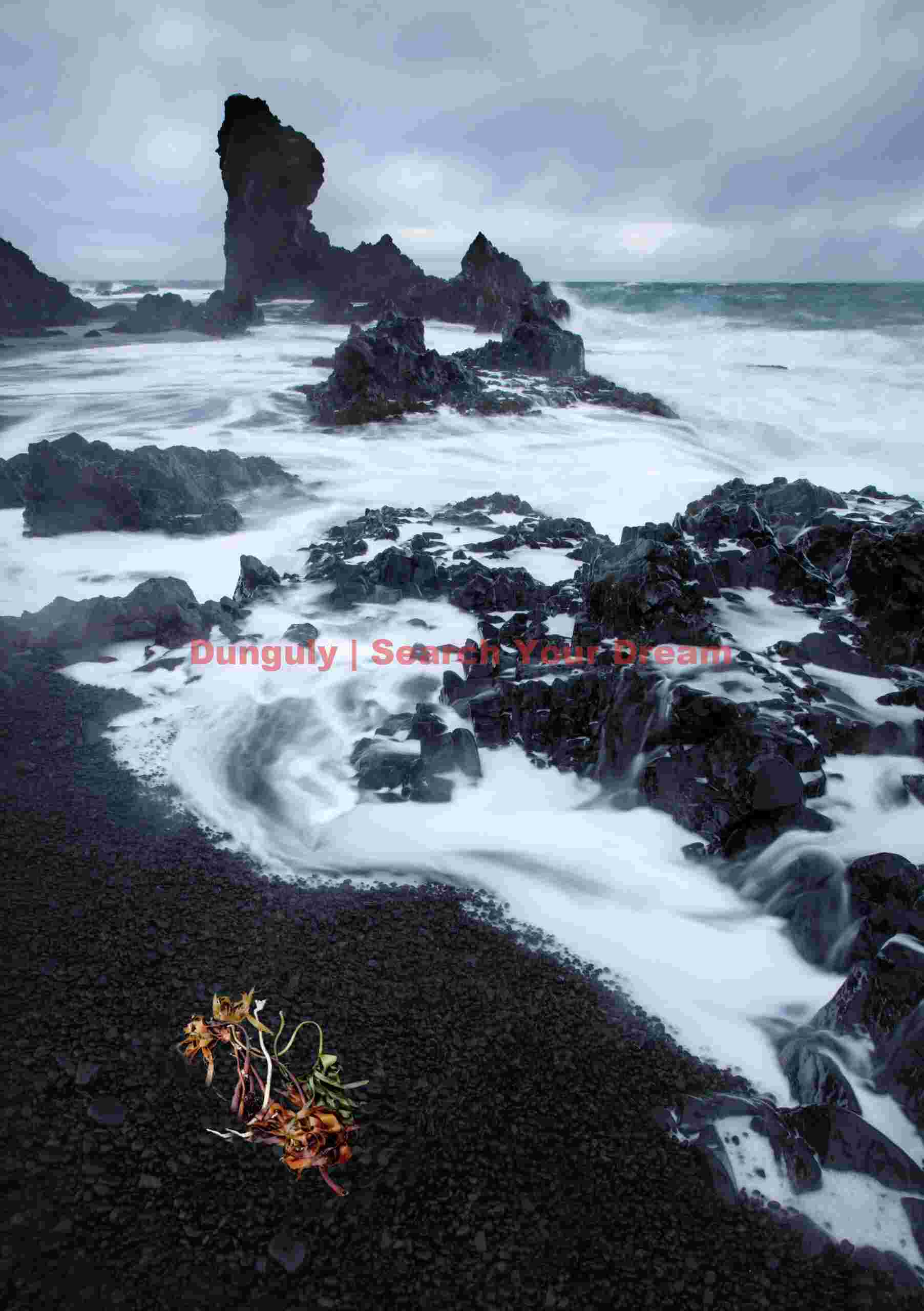 Description: A stunning photograph capturing seaweed and surf on black; djupalonsandur, highlighting Iceland’s dramatic coastline where volcanic black sands meet the Atlantic Ocean.