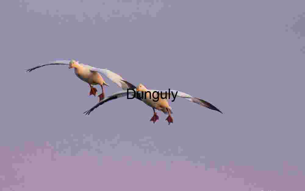 ALT Text: Two white Snow Geese in flight, wings partially blurred, legs extended for landing on a pink-hued pond crowded with hundreds of geese. Detailed visual description for accessibility and search engines, emphasizing action and color.