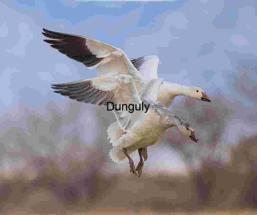 Meta Description- Dynamic shot of two Snow Geese (one adult, one ‘Blue Goose’ phase juvenile) descending in perfect synchronicity. Ideal for nature, wildlife, or flight themes.