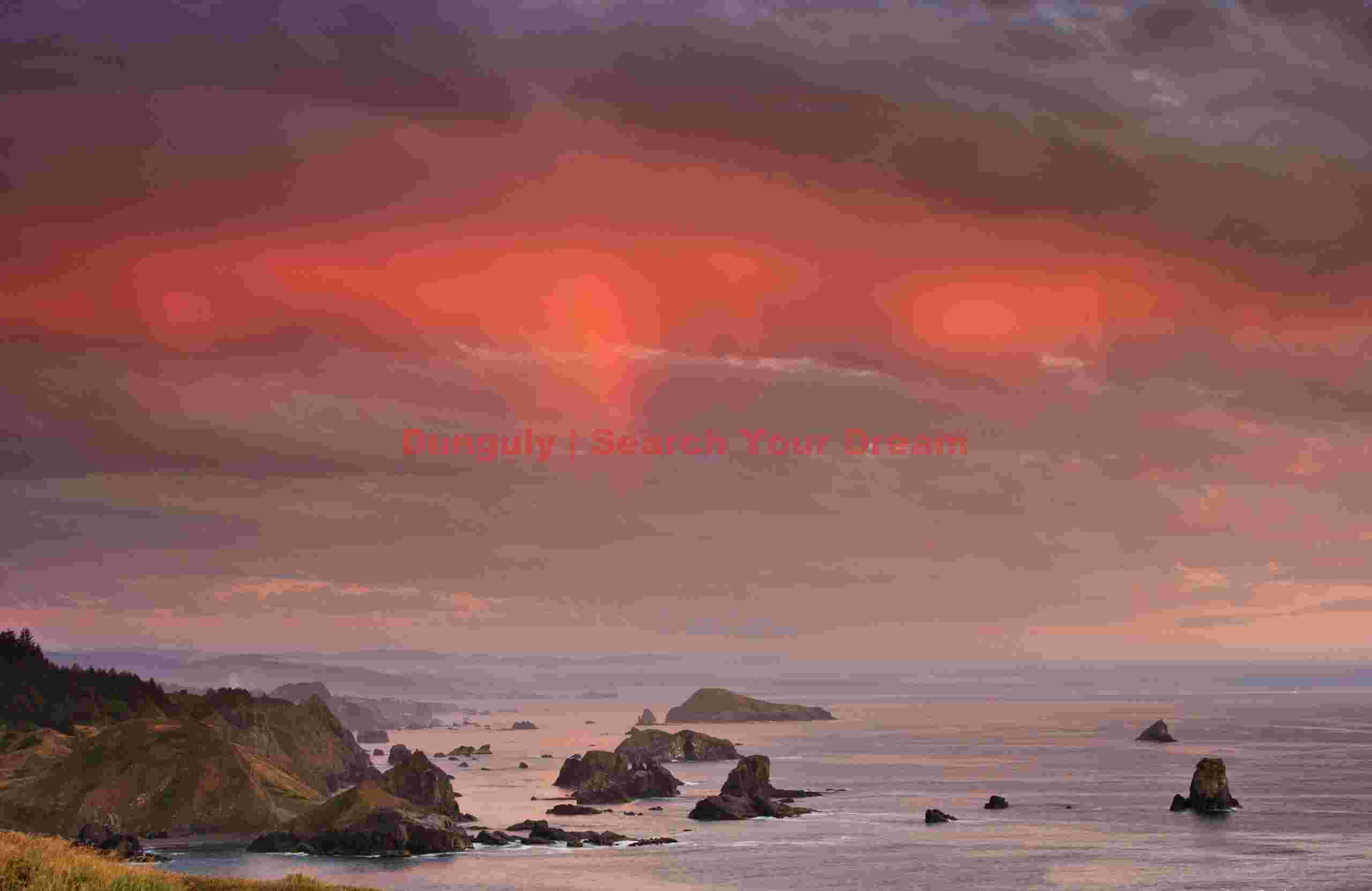 Golden light breaks through clearing storm clouds on the Oregon Coast, creating dramatic atmospheric contrast between dark, turbulent sky and brilliant illumination breaking through cloud gaps. The conflicting weather systems create visual tension and emotional intensity, suggesting nature’s raw power and the ever-changing character of coastal weather. This dynamic moment captures the transition between storm and clear conditions.