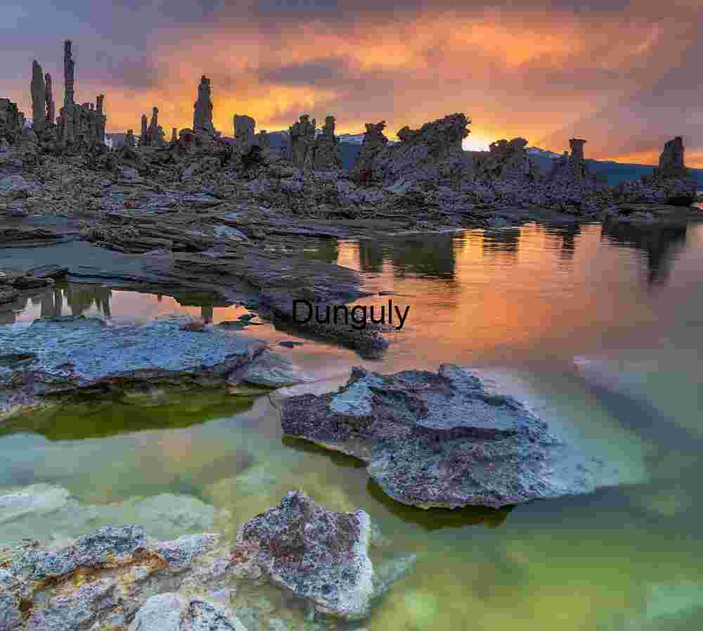 As the sun dips below the horizon, Mono Lake transforms into a surreal canvas of color and texture. Fiery hues of orange, yellow, and violet ignite the sky, mirrored on the lake’s calm surface. Jagged tufa towers—formed from calcium carbonate deposits—rise from the water like ancient sentinels, their silhouettes etched against the glowing backdrop. Submerged rocks and green-tinted shallows add depth to the foreground, enhancing the scene’s geological and visual complexity. A vivid portrayal of nature’s alchemy, where chemistry, light, and time converge.