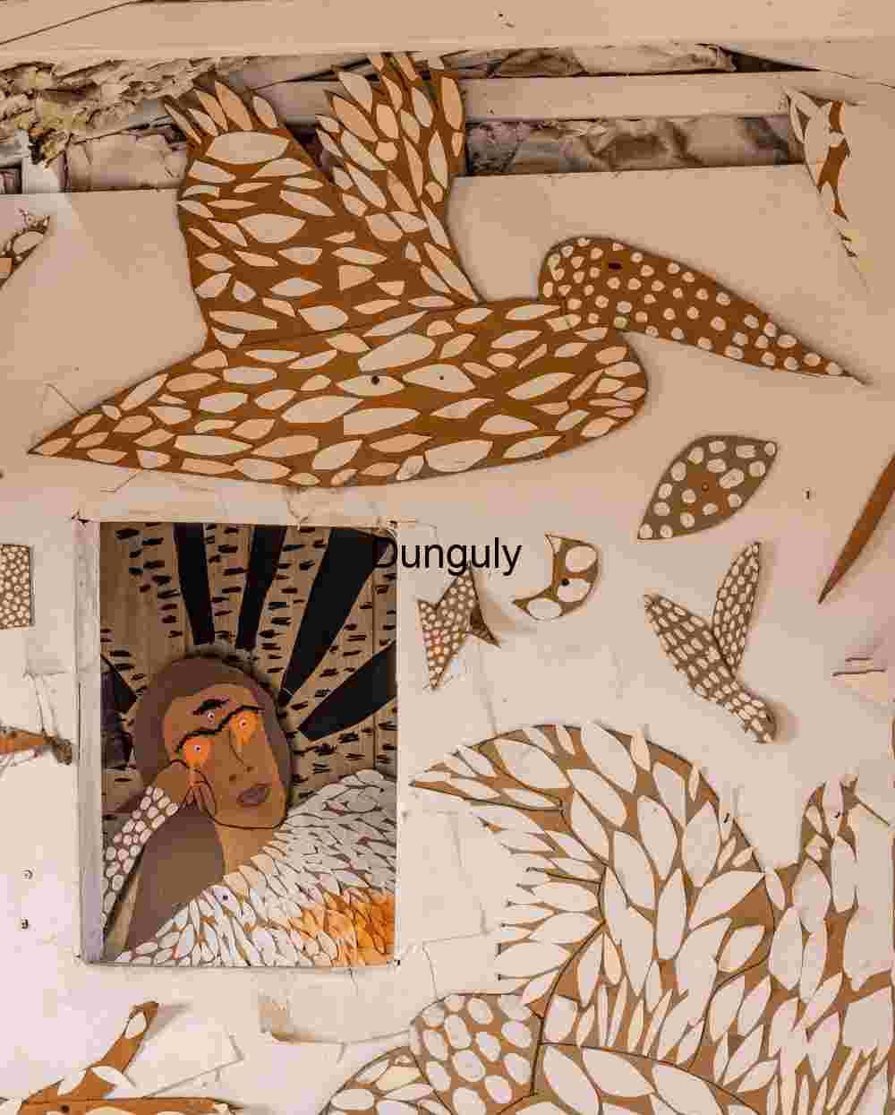 collage, artwork, birds, human, surreal, abstract, mixedmedia, texture, cutout, cardboard, paper, orange, eyes, emotion, reflection, dreamlike, stylized, composition, artistic, visual, narrative, freedom, thought, imagination, layered, design, handmade, craft, expression, figure, resting, head, hand, gaze, contrast, brown, white, shapes, pattern, background, symbolic, metaphor, introspective, creative, conceptual, mood, tone, detail, storytelling, unique, visualart, symbolism, identity