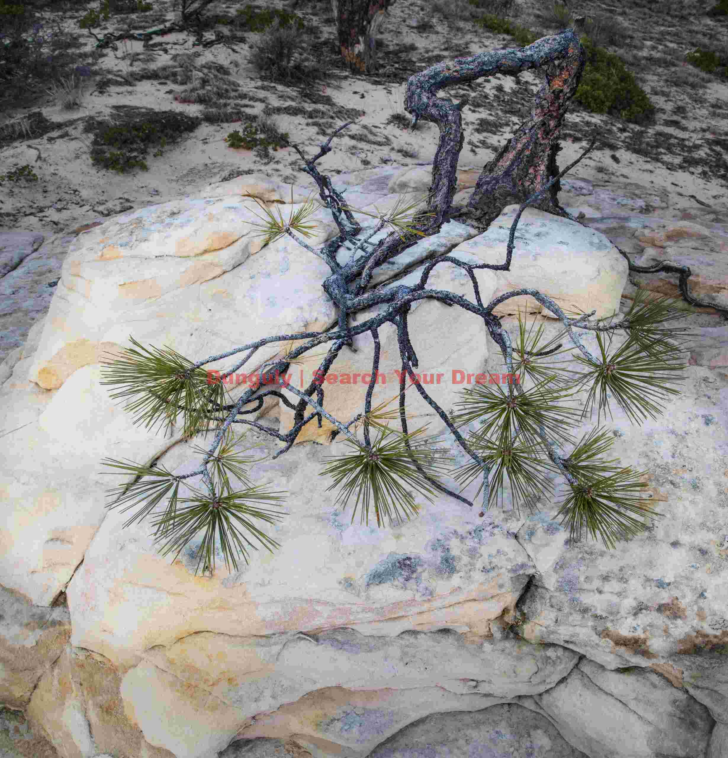 A pine tree spreads its gnarled form across the sandstone surface, gripping the rock with remarkable determination. This powerful image from The Sand Hills captures the struggle and adaptation of life in extreme environments.
