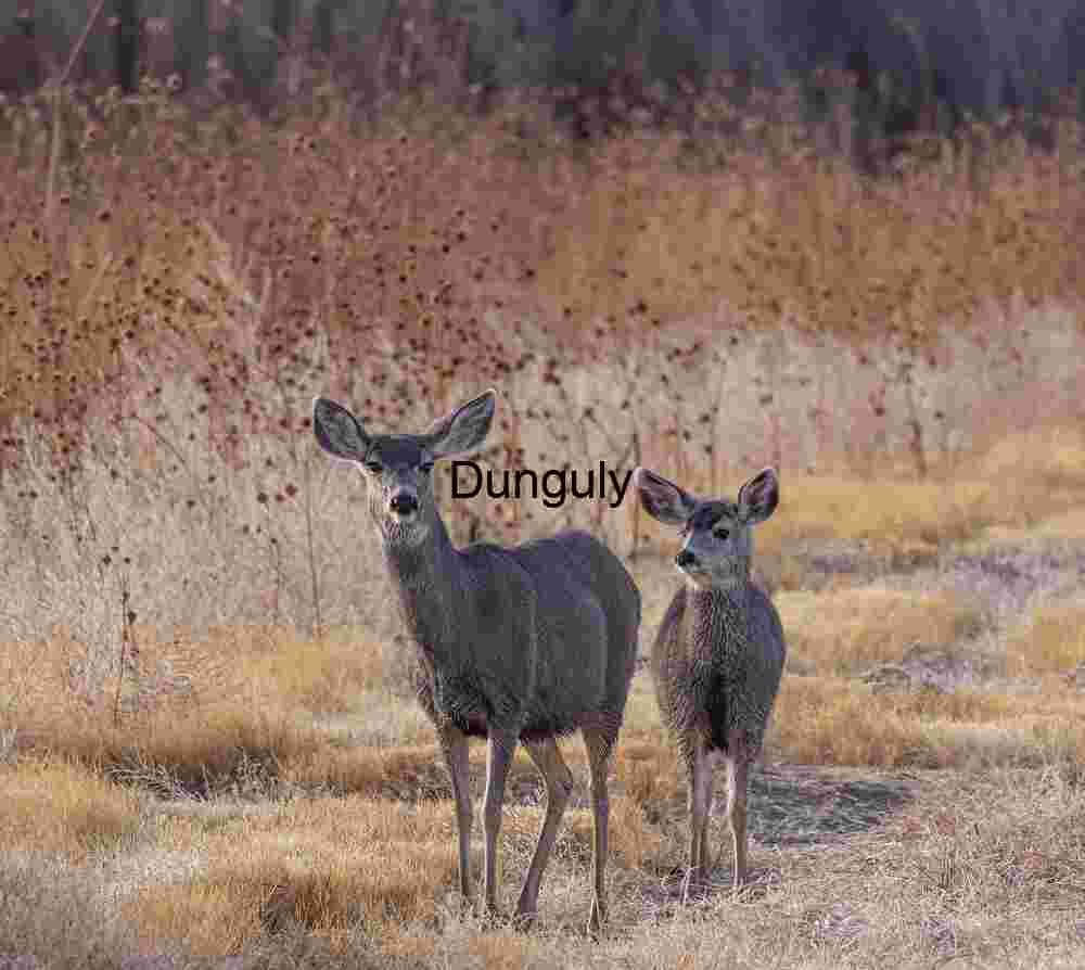 ALT Text: Two young Mule Deer, one facing forward, standing on a grassy path surrounded by dry, brown and gold winter vegetation under soft natural light.