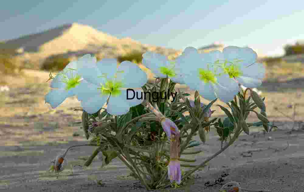 White Desert Flowers Blooming in Sandy Terrain at Golden Hour