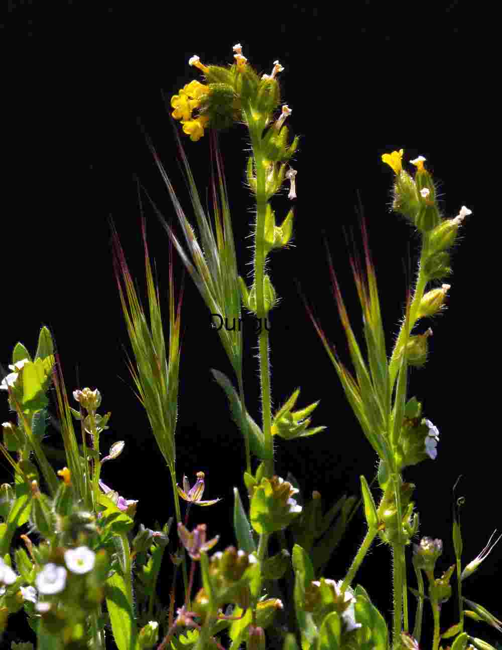 wildflower, flora, botany, grass, foxtail, barley, seedhead, stalk, silhouette, contrast, black, background, yellow, white, purple, flower, bloom, petal, stem, hairy, texture, detail, macro, closeup, nature, plant, meadow, field, wild, organic, natural, environment, ecology, biodiversity, seasonal, spring, summer, composition, artistic, editorial, scientific, botanical, fiddleneck, forget-me-not, Amsinckia, symmetry, elegance, minimal, dramatic, isolation, visual